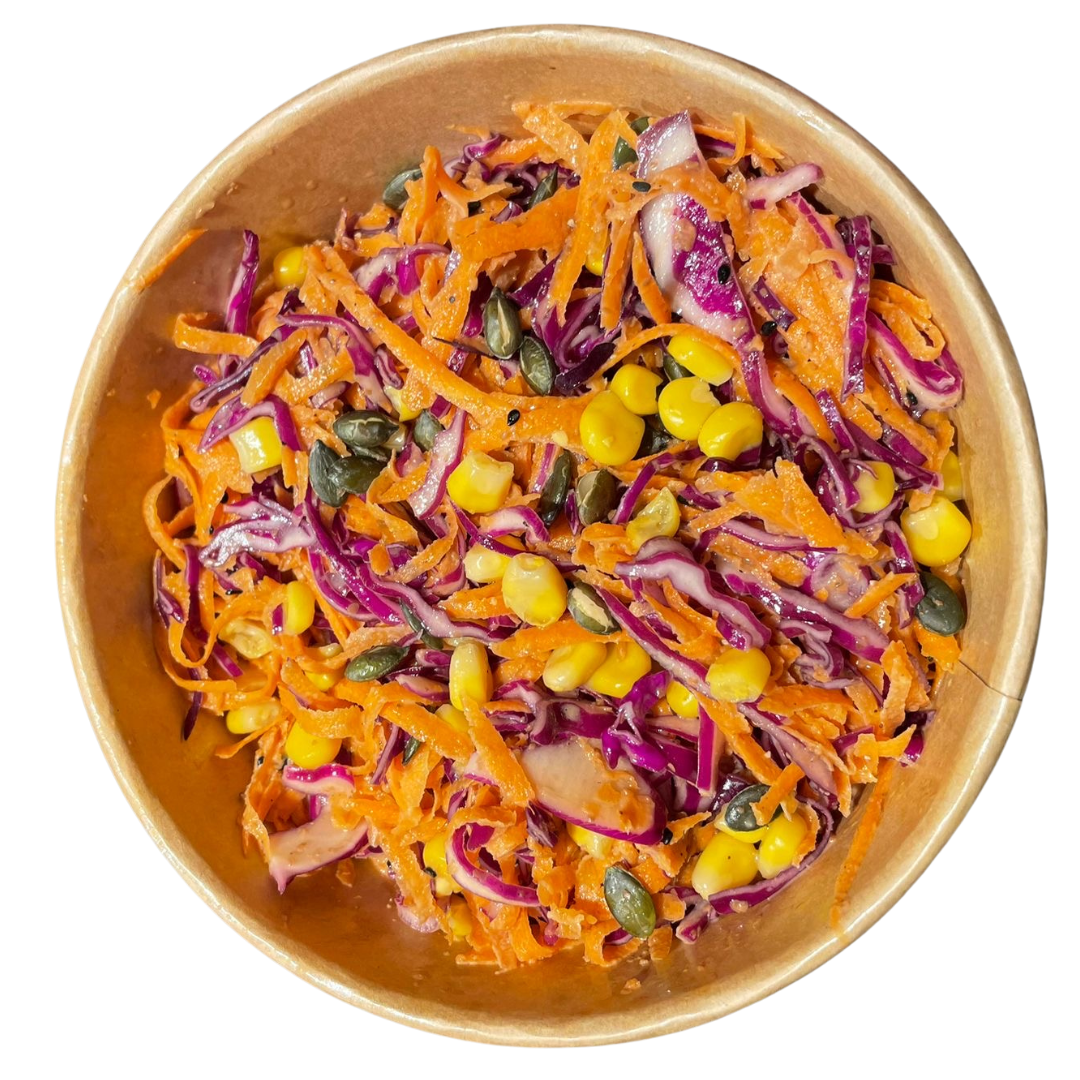 Col llombarda, pastanaga, ceba tendra, blat de moro, pipes carbassa, sèsam. Amaniment de sèsam (aigua, oli de girasol, sèsam, soja, blat, vinagre d'arròs, rovell d’ou, salsa de peix, sal).