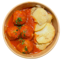 Albóndigas de pescado en salsa de marisco con patata panadera