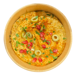 Hummus de boniato asado con granada, olivas y hierbas frescas